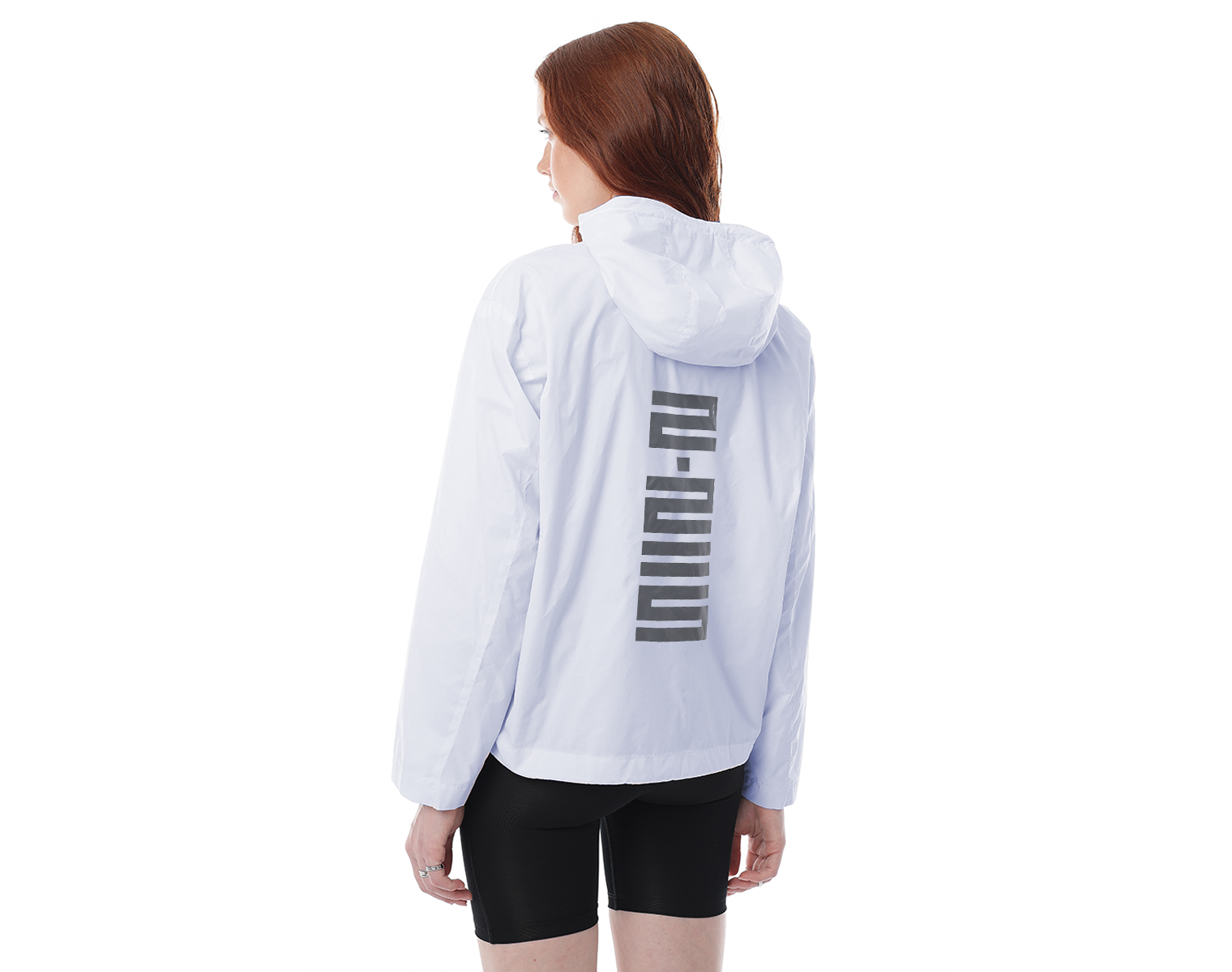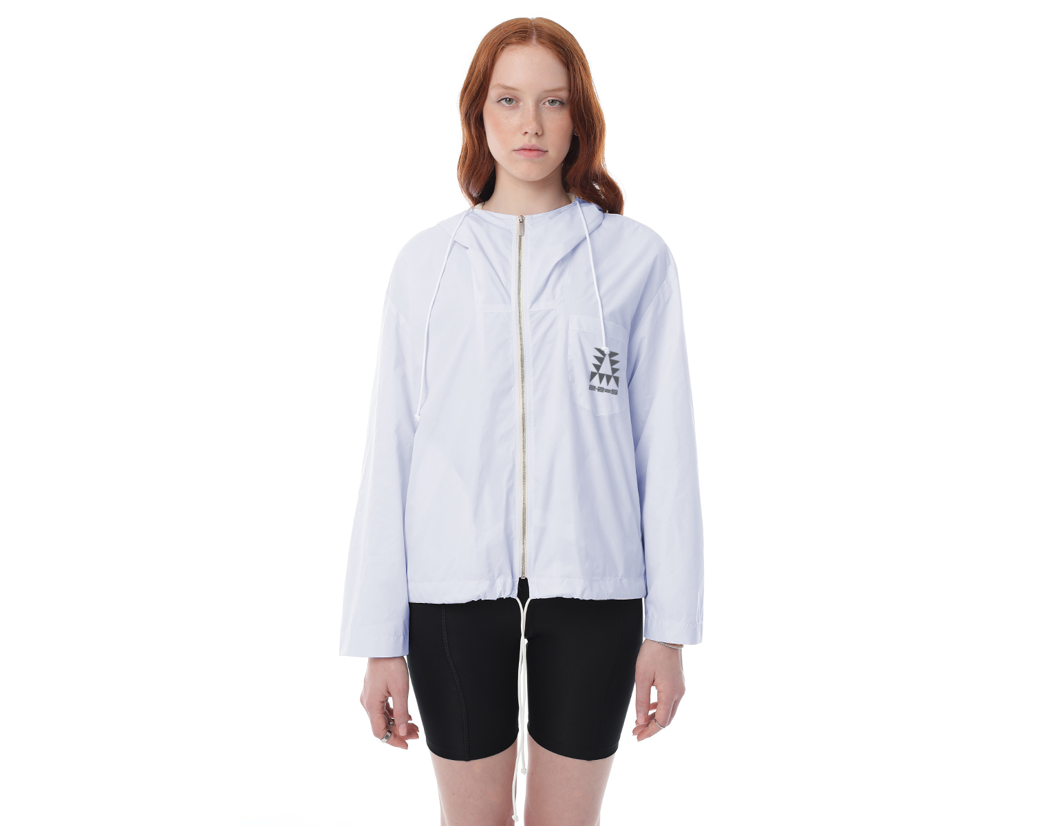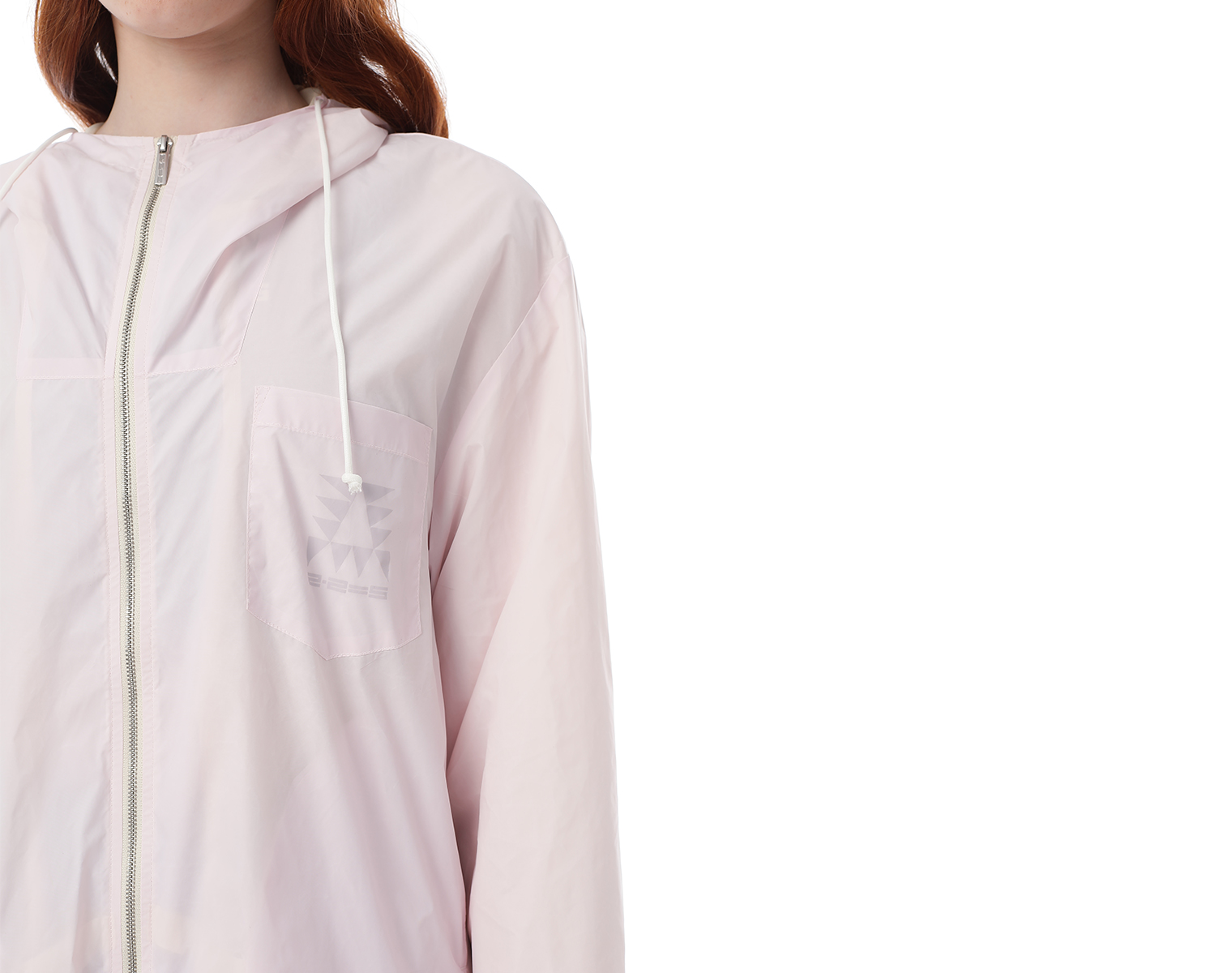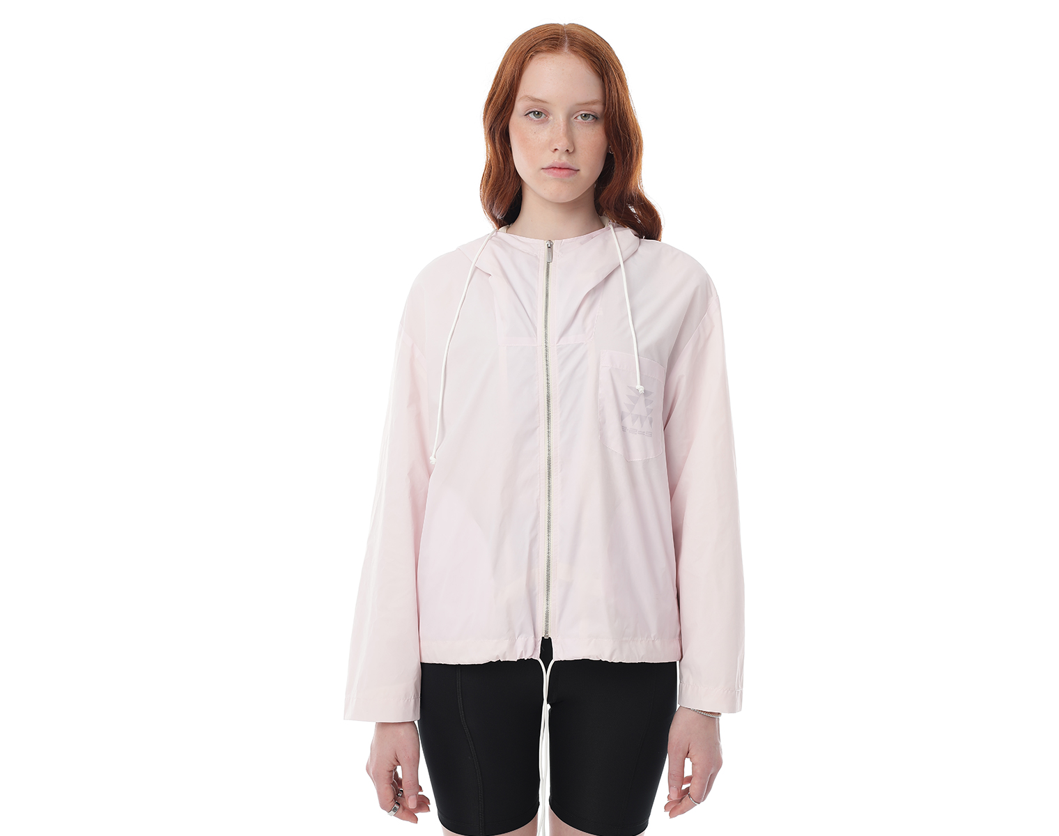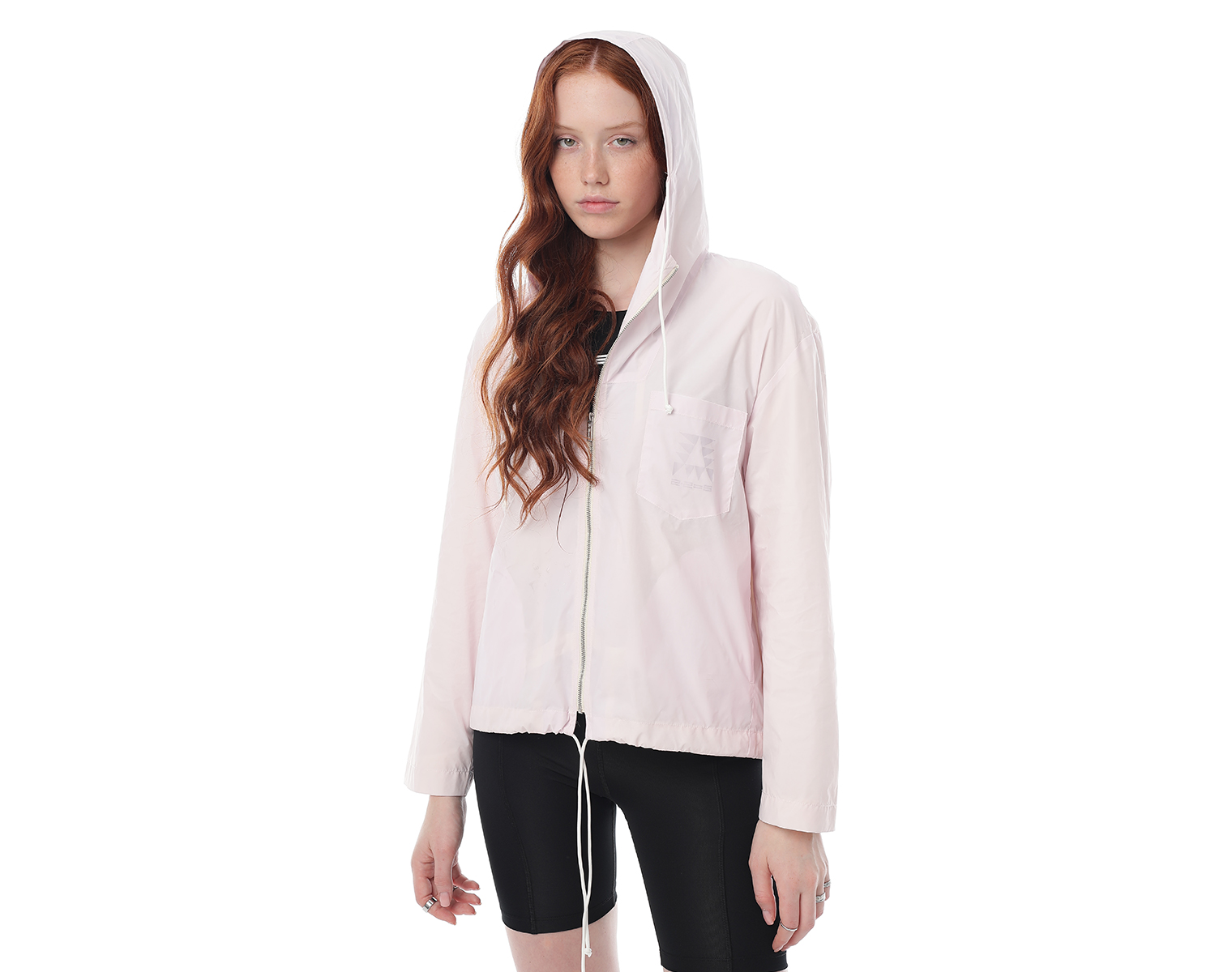 Ветровка на подкладе с капюшоном на молнии. Мидлфит. Бледно-голубая. Модель декорирована печатью в технике "шелкография". Состав ткани верха: 100% нейлон; состав подкладочной ткани: 40% лиоцель, 35% нейлон, 25% купро.