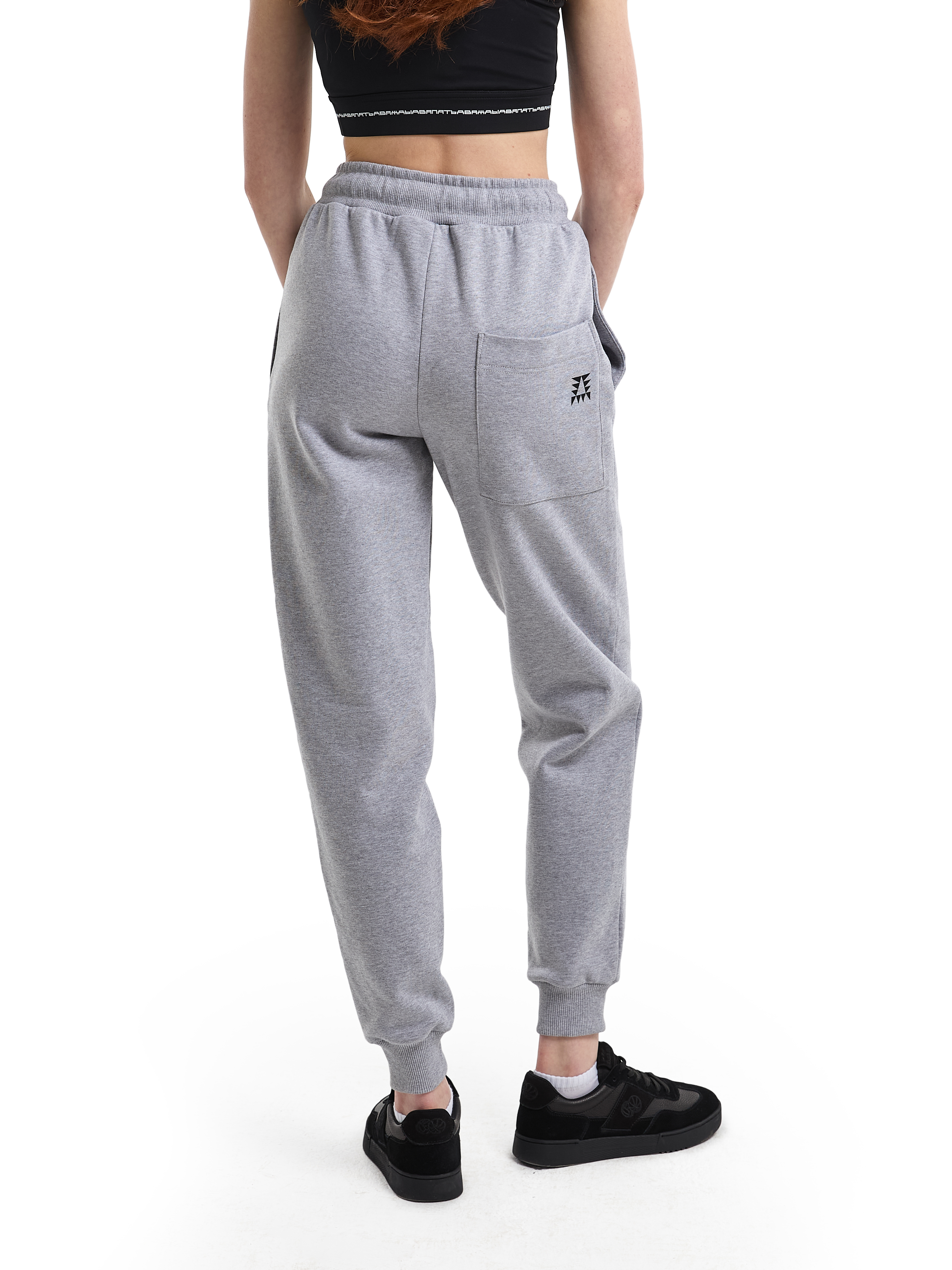 Трикотажные брюки-джоггеры на эластичном поясе-резинке и накладным карманом сзади. Серый меланж. Модель декорирована печатью в технике DTF. Мидлфит. 100% хлопок, 380 грамм.