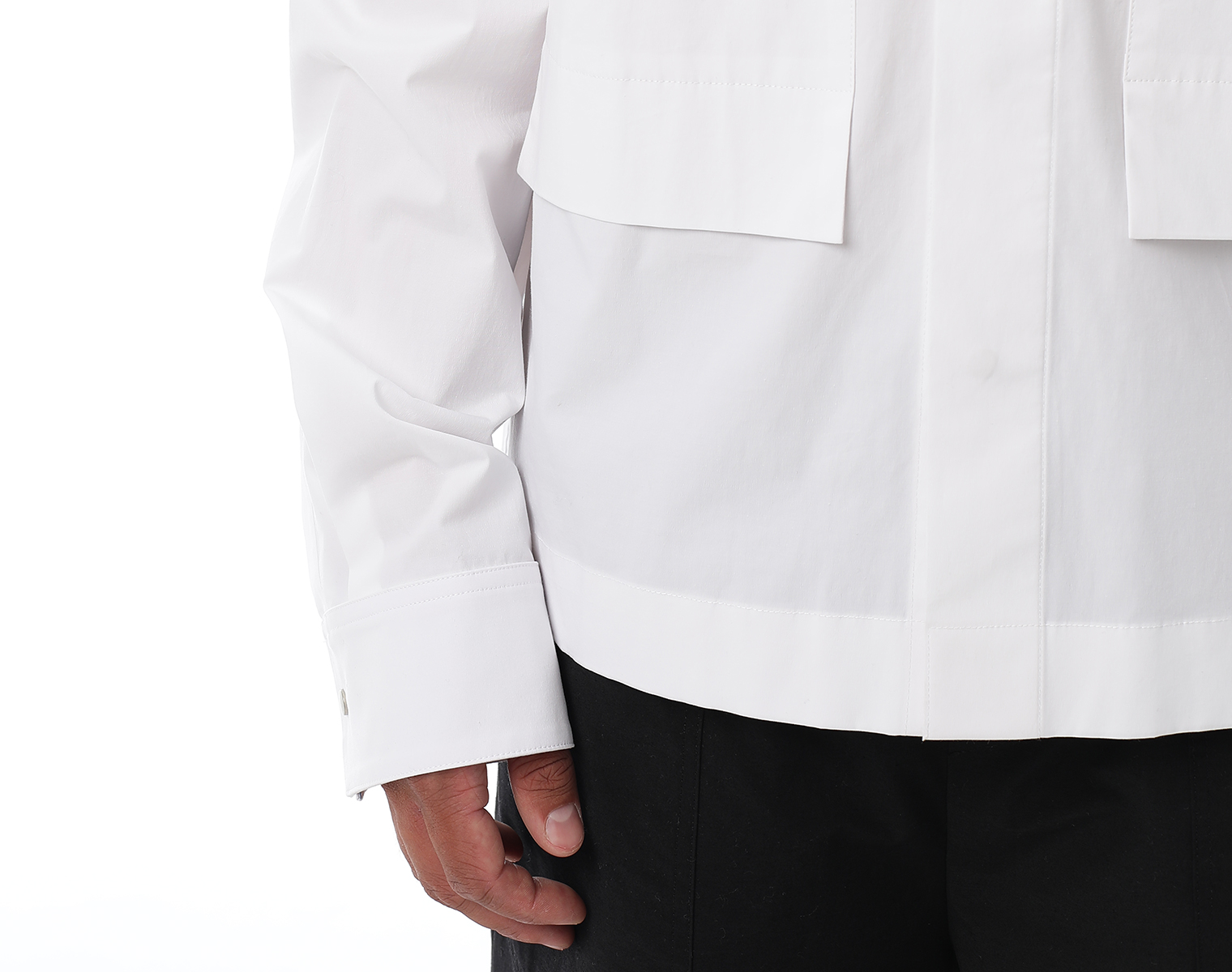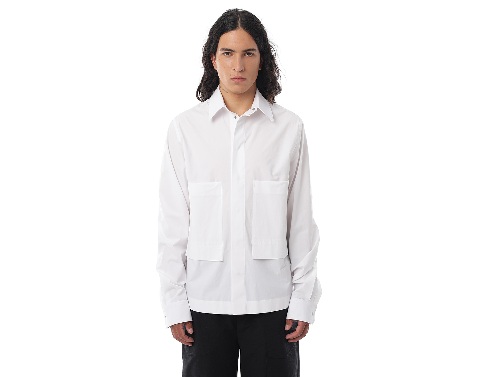 Рубашка с длинными рукавами на манжете и нагрудными карманами. Белая. Мидлфит. Модель декорирована печатью в технике "DTF". Состав: хлопок 97 % спандекс 3% 105 грамм.
