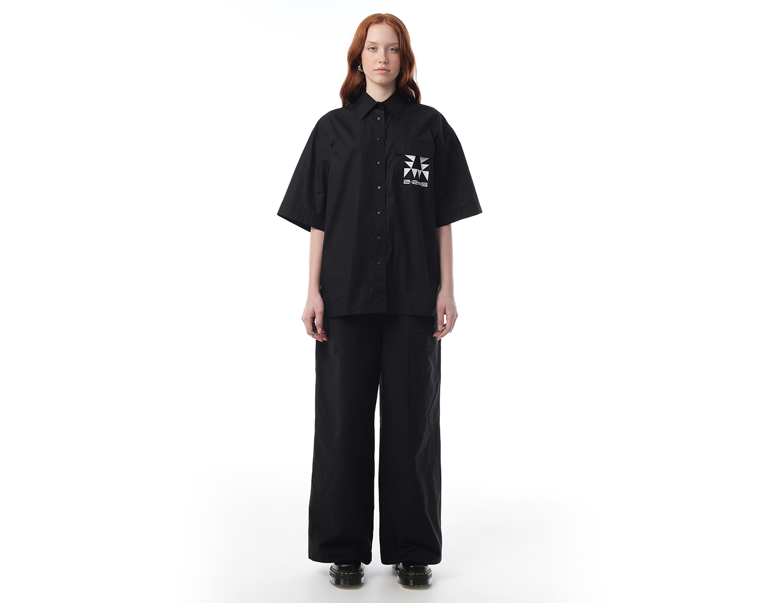 Рубашка с коротким рукавом с нагрудным карманом. Посадка оверсайз. Черная. Модель декорирована печатью в технике "DTF". Состав: хлопок 97 % спандекс 3% 105 грамм.