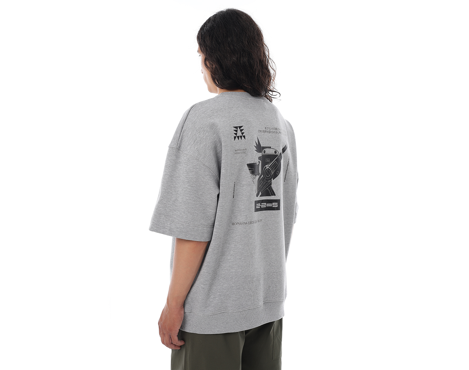 Свитшот с коротким рукавом. Светло-серый меланж. Посадка мидлфит. Футер 60% хлопок 40% полиэстер, плотность 350 грамм. Модель декорирована вышивкой в виде буквы "Д" и на спинке печатью в технике DTF.
