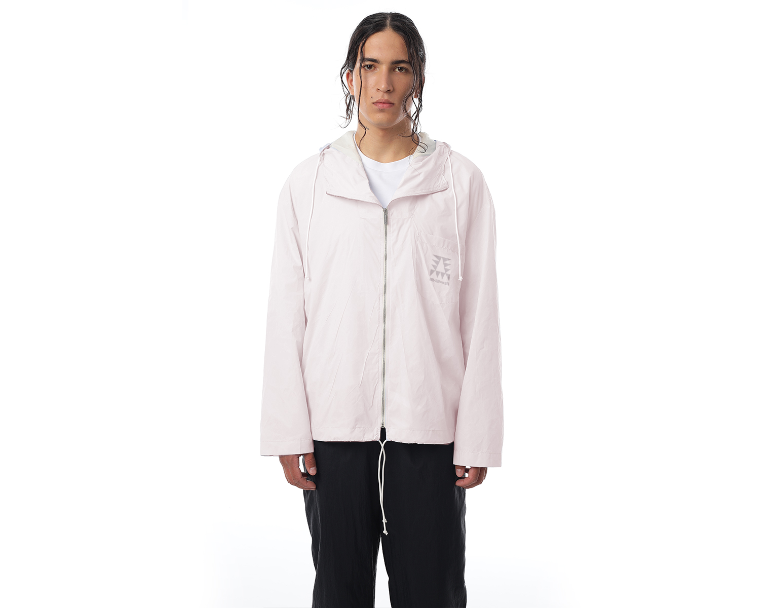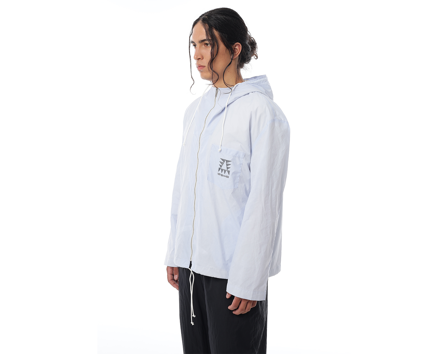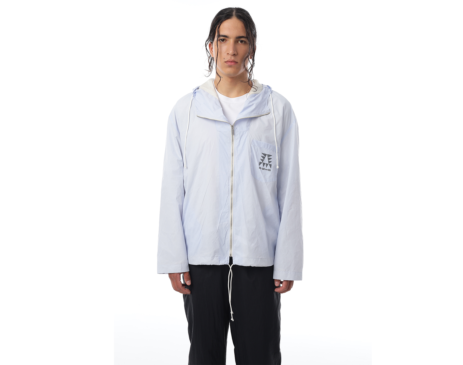 Ветровка на подкладе с капюшоном на молнии. Мидлфит. Бледно-голубая. Модель декорирована печатью в технике "шелкография". Состав ткани верха: 100% нейлон; состав подкладочной ткани: 40% лиоцель, 35% нейлон, 25% купро.